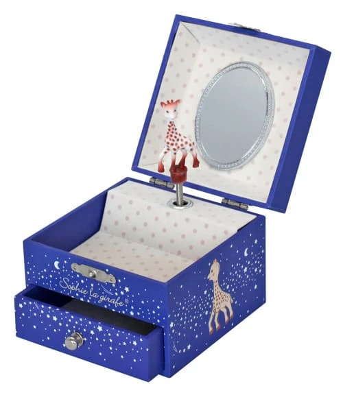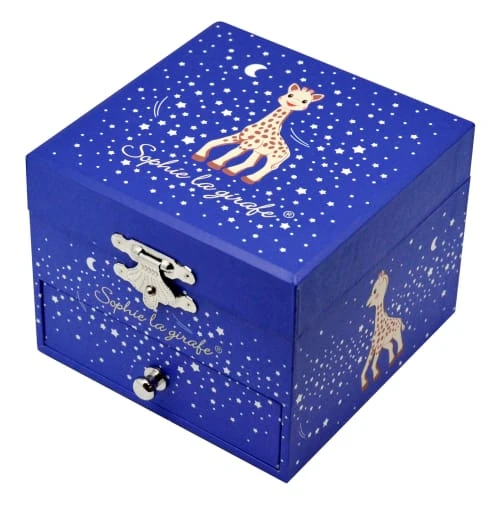 Ce coffret, fabriqué en carton solide, dispose d’un grand compartiment, d’un tiroir pour les petits secrets et d’un miroir. La figurine Sophie la girafe tourne sur elle-même au déclenchement de la musique, lorsque la boîte est ouverte. Phosphorescent, ce coffret musical brille dans la nuit.Musique : La Valse d’Amélie Poulain.