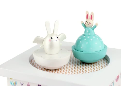 Jolie boite à musique en bois. Lesfigurines se mettent à tourner au déclenchement de la musique. Dimensions boite à musique : 11.5 x 11.5 x 7 cm.
